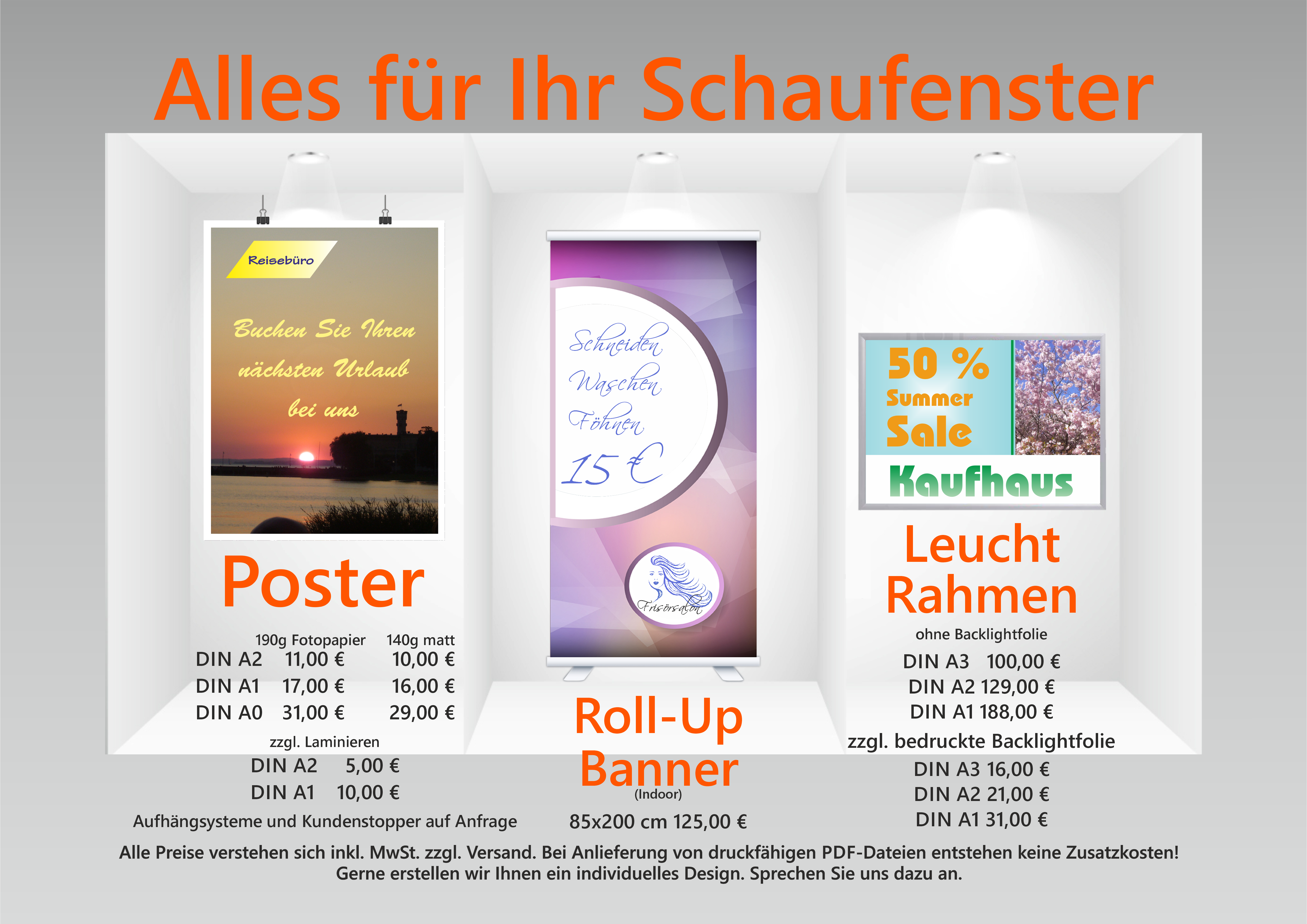 Ihnen schwebt schon lange vor Ihr Unternehmen und Ihre Produkte direkt am POS zu präsentieren? Poster, Roll-Up’s und Leuchtrahmen erzeugen Aufmerksamkeit. Egal ob in Ihren Räumen, im Schaufenster, auf Messen oder bei Veranstaltungen erreichen Sie Ihre Kunden da, wo sie sofort kaufen können.
